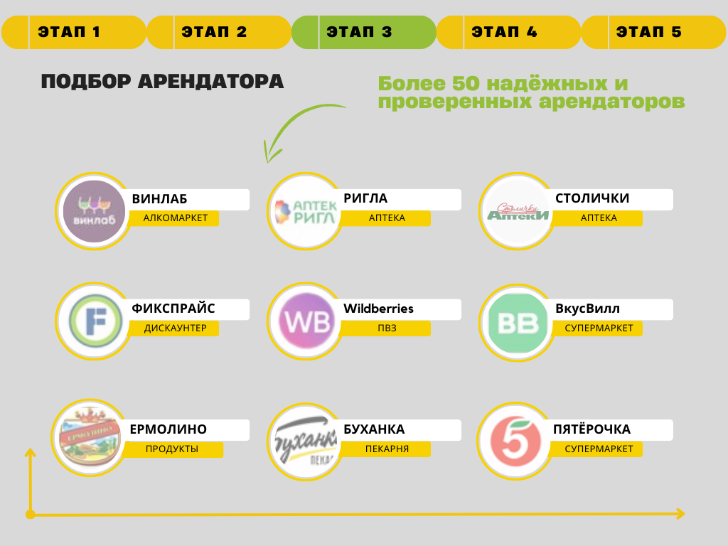 Вы получаете максимум дохода благодаря нашей экспертизе. База из 50+ проверенных федеральных и региональных арендаторов (таких как аптека «Столички», супермаркет «Пятёрочка» и «ВкусВилл») и глубокая экспертиза в переговорах позволяют нам заключать договоры аренды на лучших для вас рыночных условиях.