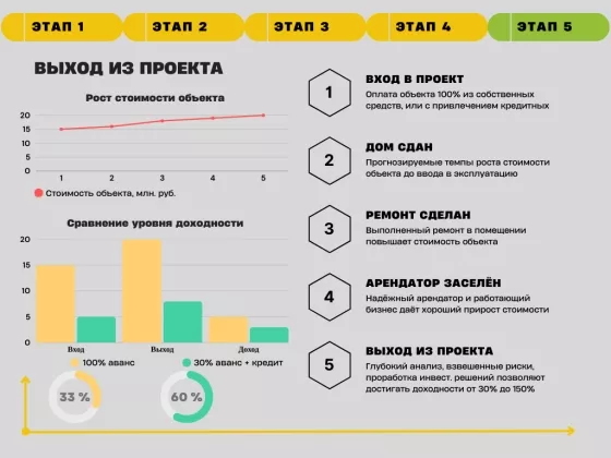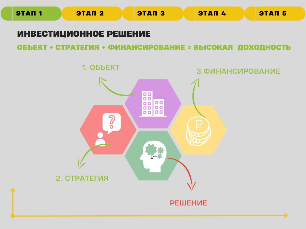 Инвестиционное решение. Совместно разрабатываем стратегию. Подбираем ликвидный объект, анализируем все риски и выбираем оптимальную модель финансирования (100% собственные средства или с использованием кредитного плеча).