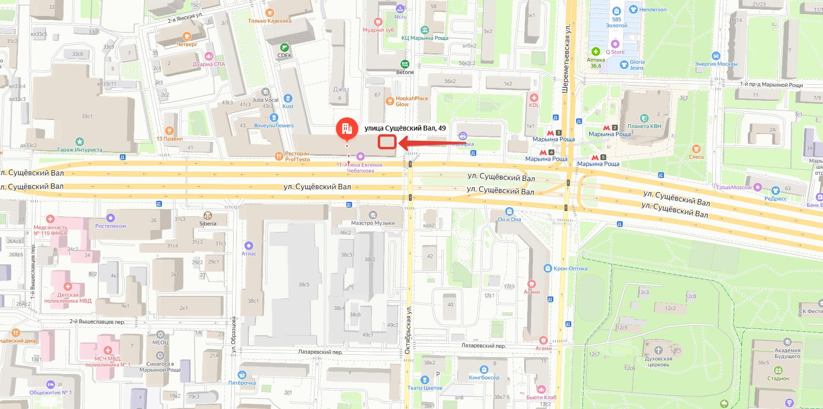 Сдается в аренду помещение на ул. Сущёвский Вал, 49, в 1 минуте ходьбы от метро Марьина Роща. В районе станции метро “Марьина Роща” сформирована насыщенная деловая инфраструктура. Большинство бизнес-центров расположены в пешей доступности от метро (10-15 минут ходьбы). Район характеризуется хорошей транспортной доступностью и развитой деловой инфраструктурой, что делает его привлекательным для размещения офисов и коммерческих помещений.
