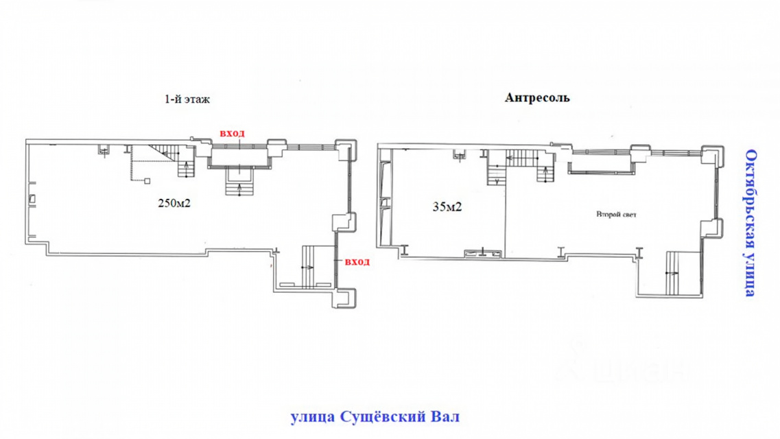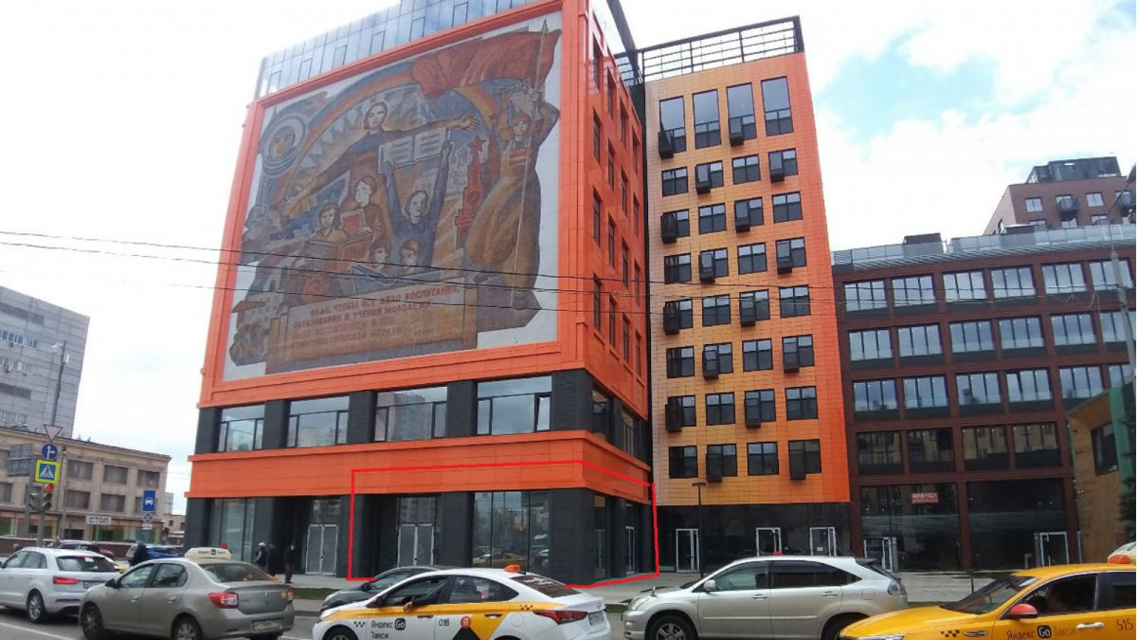 Общая площадь: 285 кв.м. (1-й этаж - 211,5 кв.м., антресоль - 73,6 кв.м.). Два отдельных входа с фасада. Высота потолков – 6,5 м. Электрическая мощность – 100 кВт.  Возможность размещения вывески.