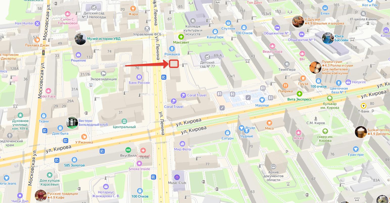 - Рядом расположен главный транспортный узел города - перекрёсток улиц Ленина и Кирова.