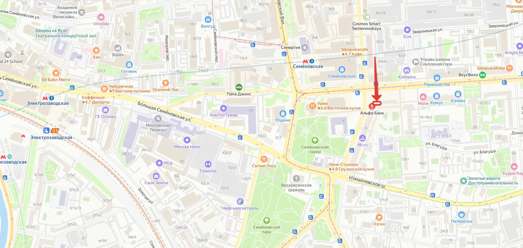 В радиусе 300м: продуктовый рынок "Московские ярмарки, ТЦ Семёновский, Альфа -Банк, Кредит Европа Банк, Союз Цвет Торг, Терволина, Сударь, Пуховик. ру, Ароматный Мир, Инвитро, супермаркет Вкусвилл и Куулклевер, кафе и рестораны.