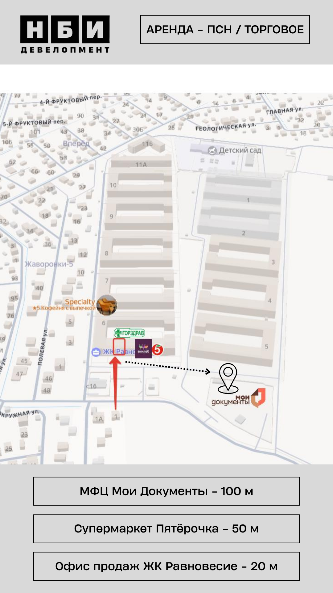 Сдаётся в аренду от собственника помещение на въезде в новый ЖК Равновесие. Помещение на первой линии к строящемуся МФК и к основному въезду из Москвы. Территория ЖК открыта - свободный доступ и свободная парковка возле помещений. Масштабный жилой комплекс рассчитанный на 10 тысяч жителей, в нем уже построен детский сад и будет МФК - что сделает его точкой притяжения трафика со всего ближайшего окружения. Введена в эксплуатацию 2 очередь - квартиры заселяются, многие сдавались с ремонтом. 1я очередь сдана в 2023 году и уже заселена. В соседних помещениях уже работают сети Пятерочка, Винлаб, Аптека Горздрав, которые являются магнитом притяжения трафика.