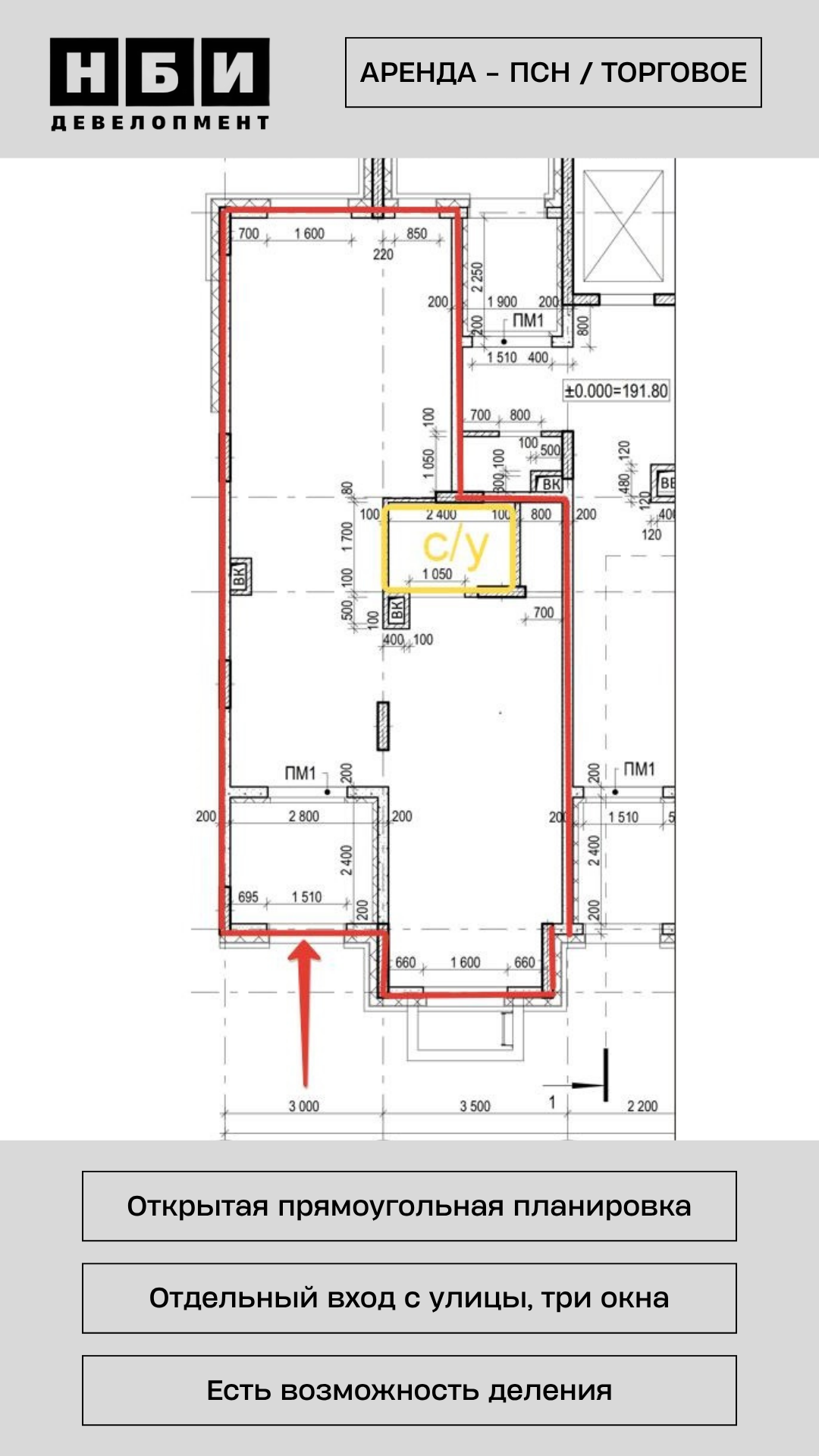 Общая площадь: 73,3 кв.м., 1 этаж. Отдельный вход с фасада. Витринное остекление. Просторное помещение прямоугольной формы с удобным планировкой. Высота потолков – 3,5 м. Электрическая мощность – 14 кВт. Центральное отопление. Возможность размещения вывески. Бесплатная парковка перед входом.