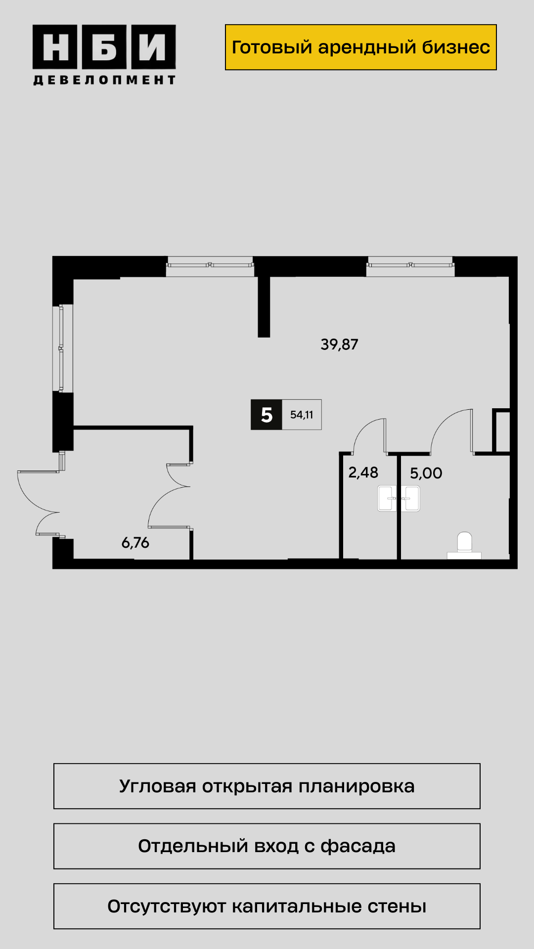 Общая площадь: 54,1 кв.м., 1 этаж. Отдельный вход с фасада. Просторное помещение прямоугольной формы с удобной планировкой. Высота потолков – 3,7 м. Электрическая мощность – 10 кВт. Центральное отопление. Возможность размещения вывески.